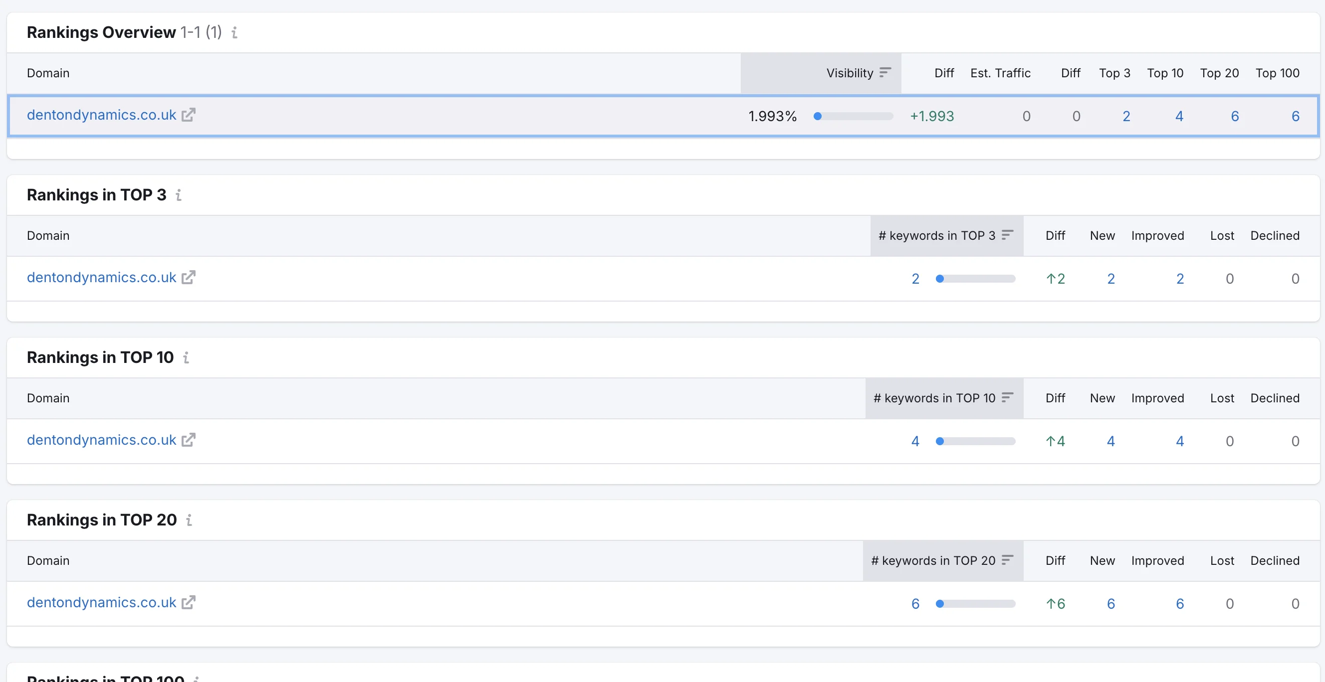 Every site we build is tracked from launch. These are real keyword rankings from SEMRush Position Tracking — verified data, not vanity metrics.